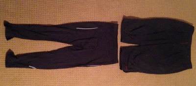For my legs, I wear capri pants over bike shorts. As the temperature dips into the lower 40's, I wear a pair of running tights under the capri pants. This is a matter of personal preference as I know some riders who never cover their legs until it starts snowing!